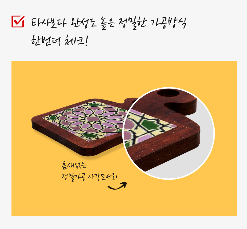°î·üÀÌ 0.1mm°¡ µÇµµ·Ï Á¤¹ÐÇÏ°Ô µÎ¹ø °¡°øÇÏ¿© »ç°¢Å׵θ® ¸ð¼¸® ÀÌÇüÀ» ¾ø¾Ö°í ¸Å²ô·³°Ô ó¸®ÇÏ¿© Á¦Ç°ÀÇ ¿Ï¼ºµµ¸¦ ³ô¿´½À´Ï´Ù