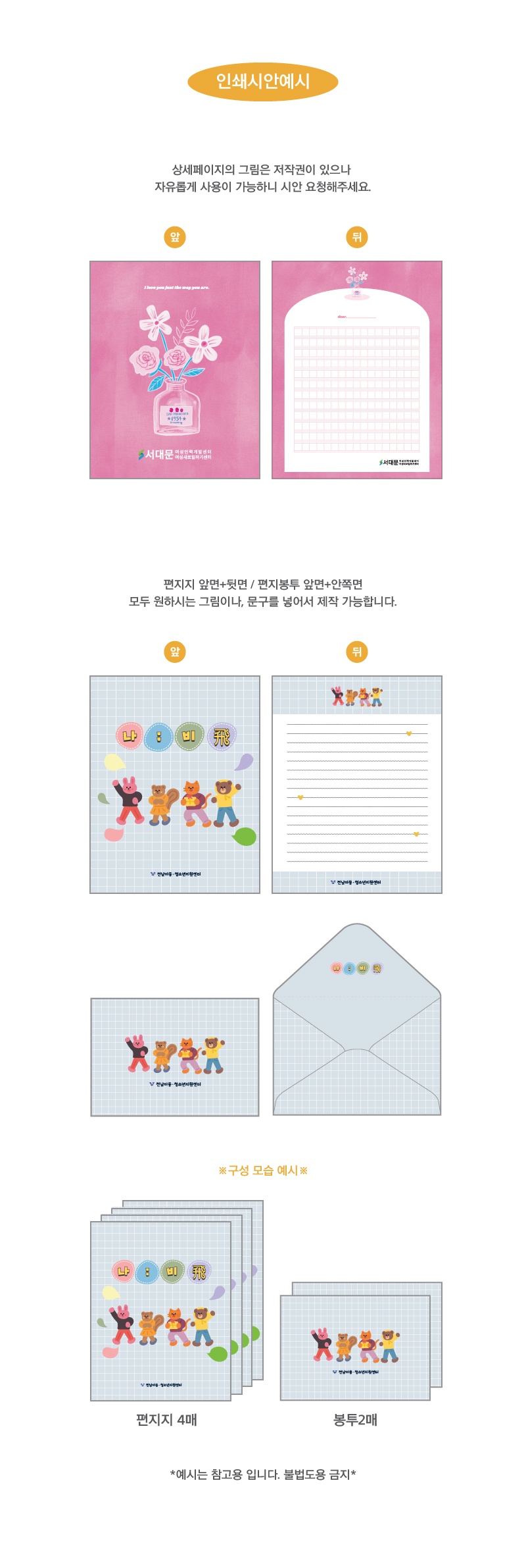 - Àμ⸦ ÇϽô °æ¿ì, ´ç»ç¿¡¼´Â °í°´´ÔÀÌ º¸³»ÁֽŠ¿ø°í ¹× µµ¾ÈÀ» ±âº»À¸·Î ÇÏ¿© Çʸ§À» Á¦ÀÛÇϰí, Á¤È®¼ºÀ» ±âÇϱâ À§ÇØ °í°´´Ô°ú ÀçÈ®ÀÎ ÈÄ ½ÇÁ¦ Àμâ ÀÛ¾÷À» ÇÕ´Ï´Ù. (ÃÖÁ¾ µðÀÚÀÎ ½Ã¾ÈÀÇ À߸øµÈ È®ÀÎÀº Ã¥ÀÓÀÌ ¼ö¹ÝµÇ¹Ç·Î Á¤È®ÇÏ°Ô È®ÀÎÇÏ¿© Áֽñ⠹ٶø´Ï´Ù.)